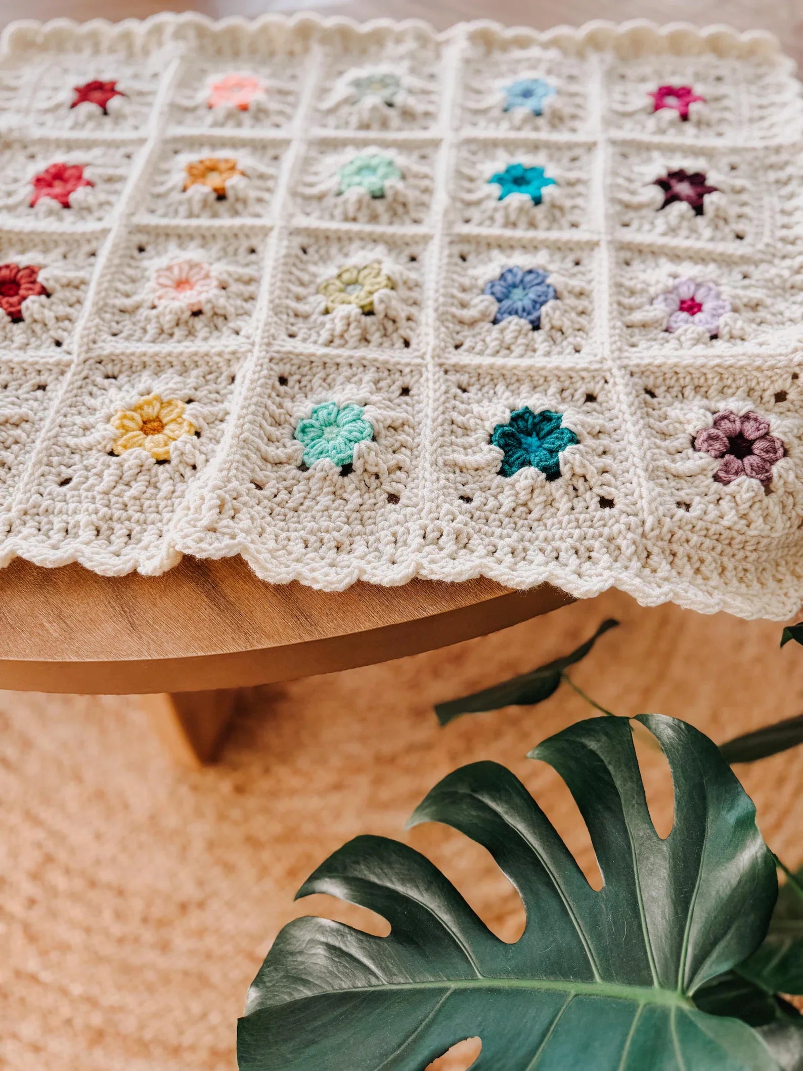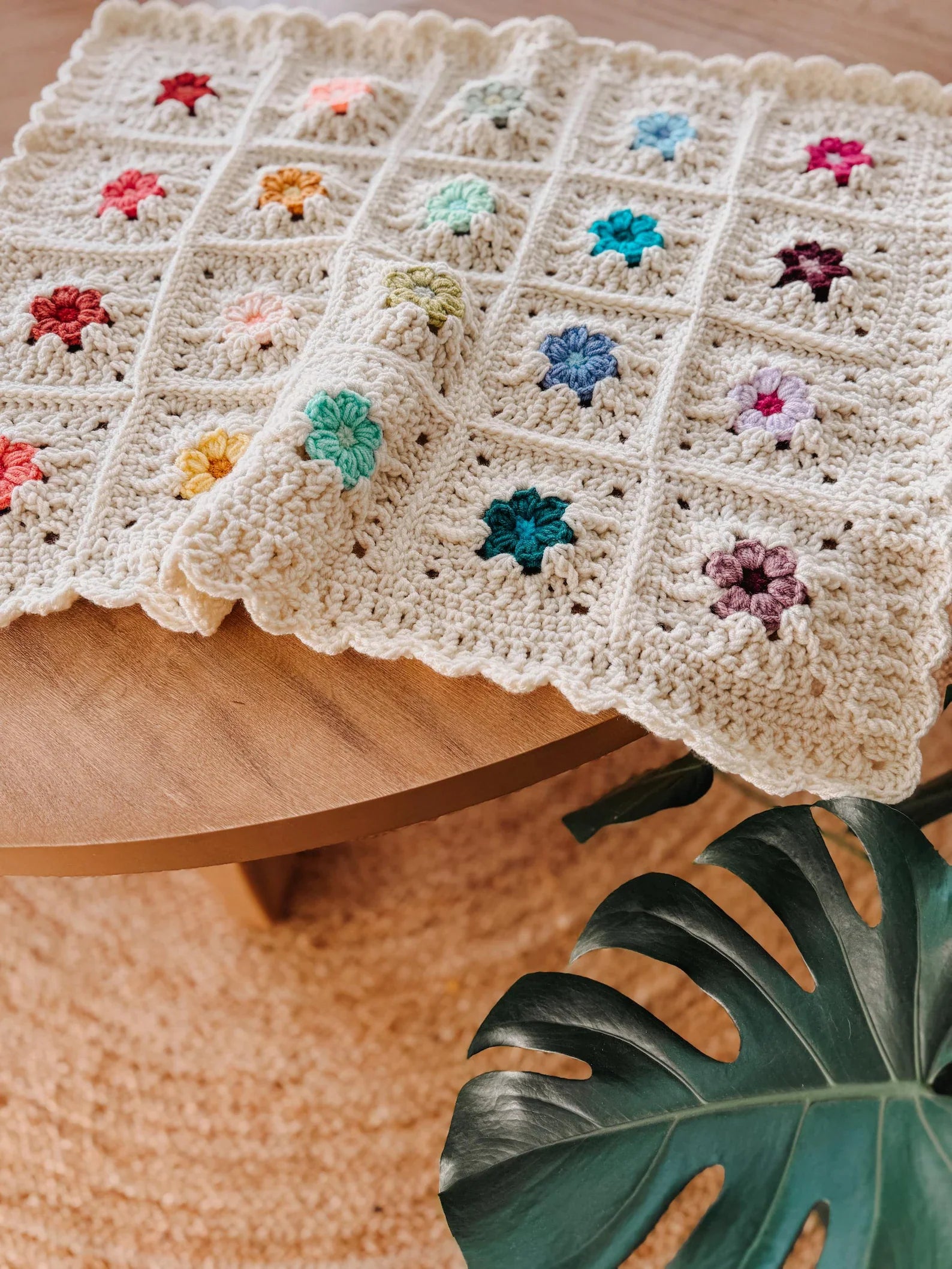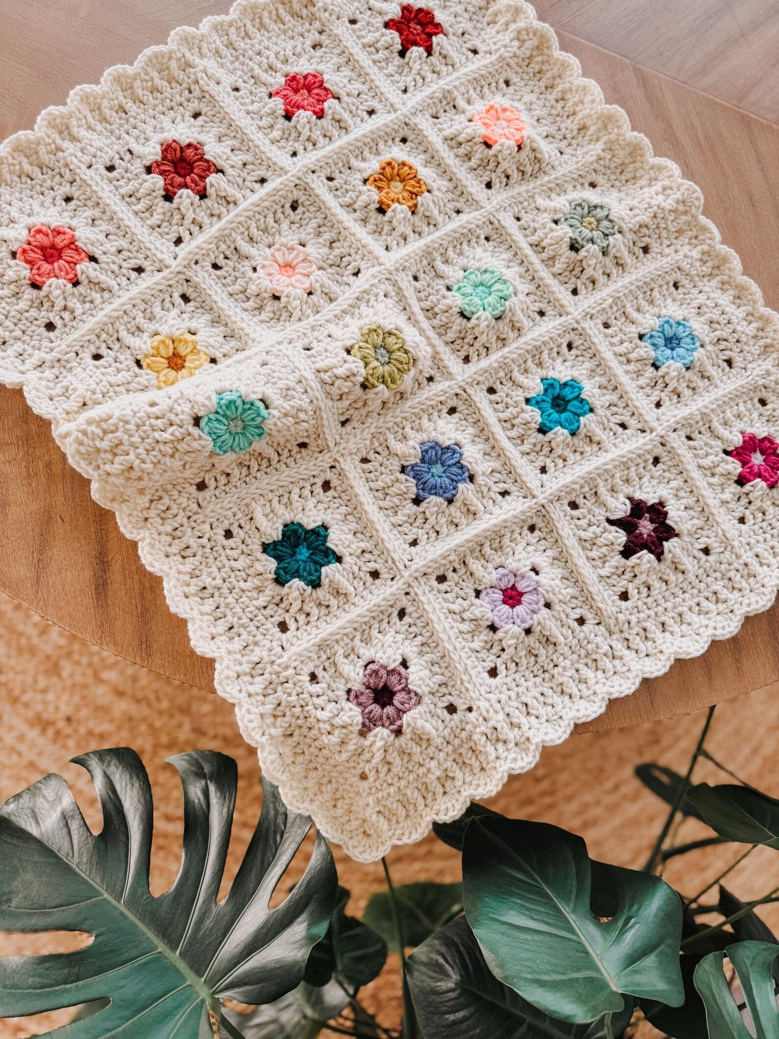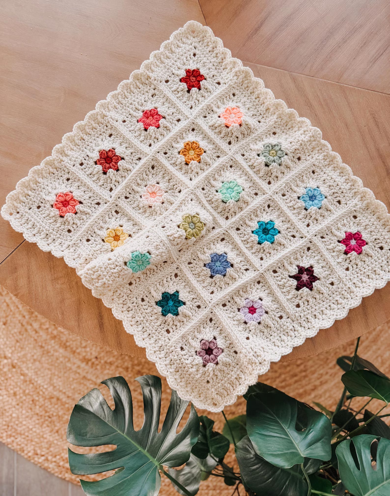 This beautiful design blends classic crochet techniques with playful flower motifs, creating a blanket that feels both modern and nostalgic.