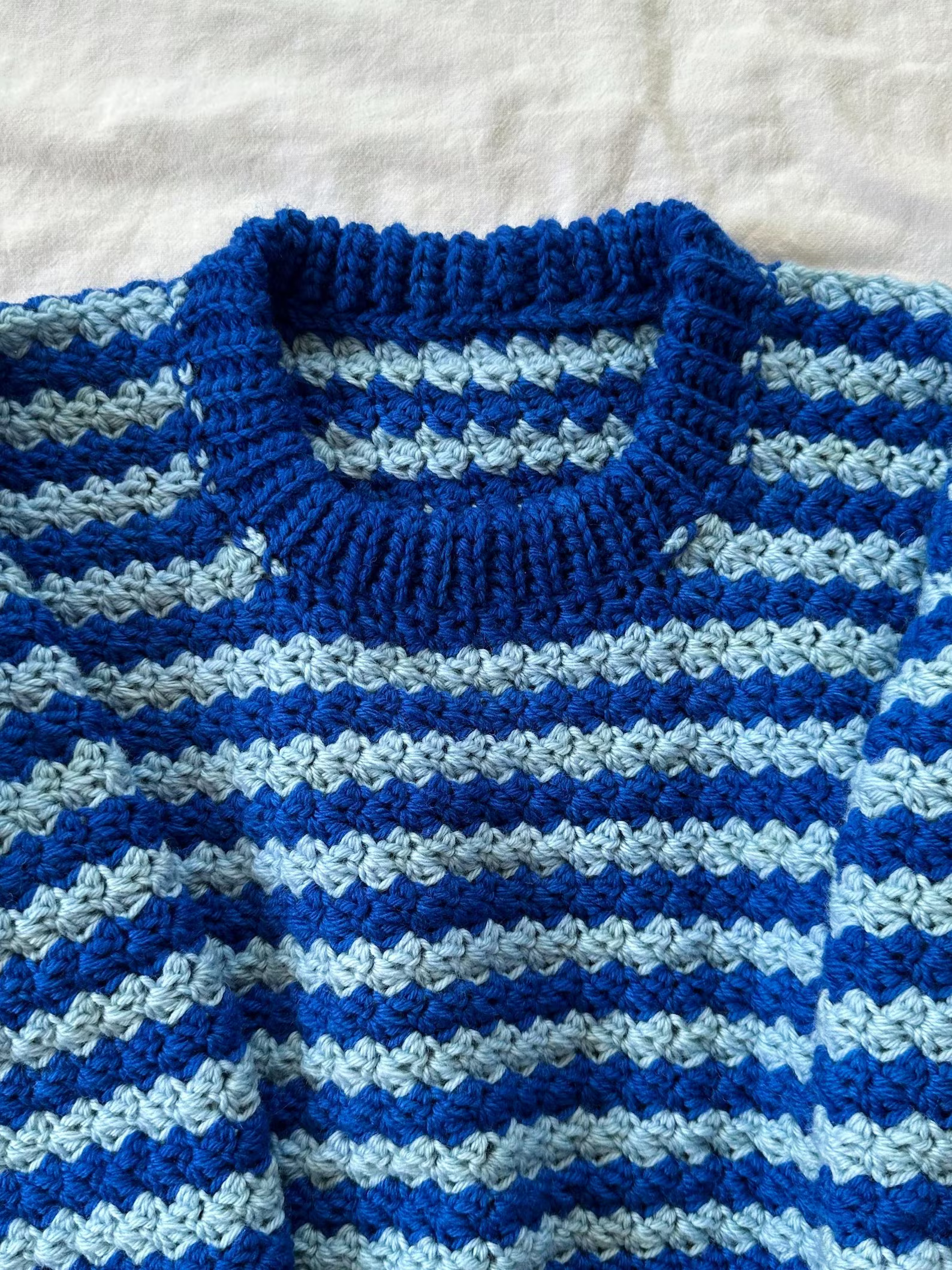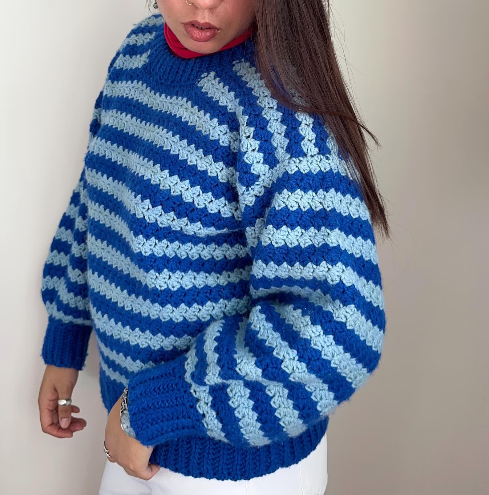 With an oversized fit, folded collar, and fun stripe design, this pattern is perfect for everyday wear, chilly evenings, and layering all year round.