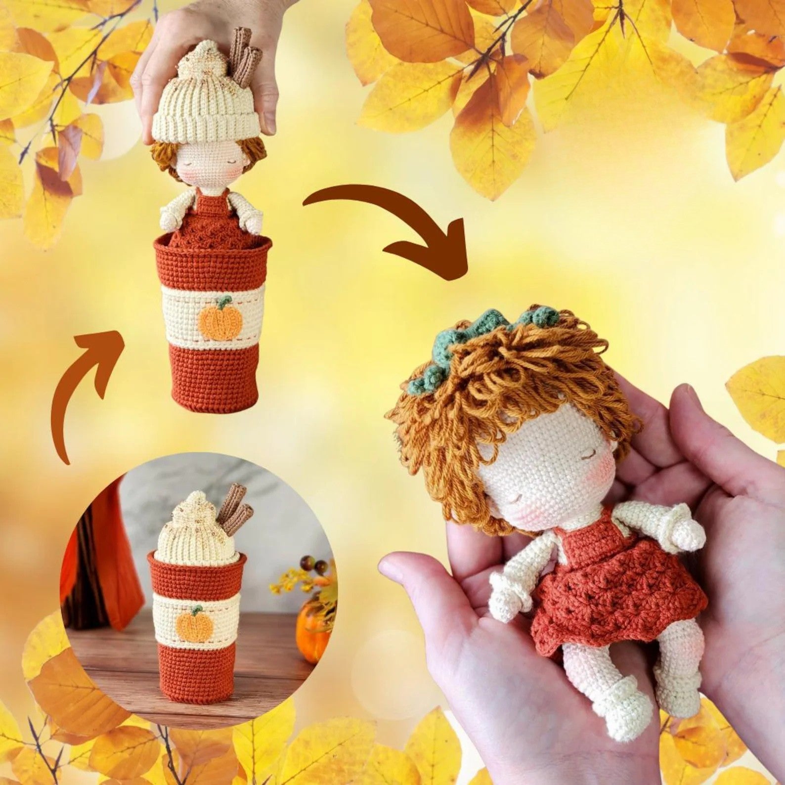 Combines sweet baby doll details with a pumpkin spice cup for a cozy, creative handmade piece.